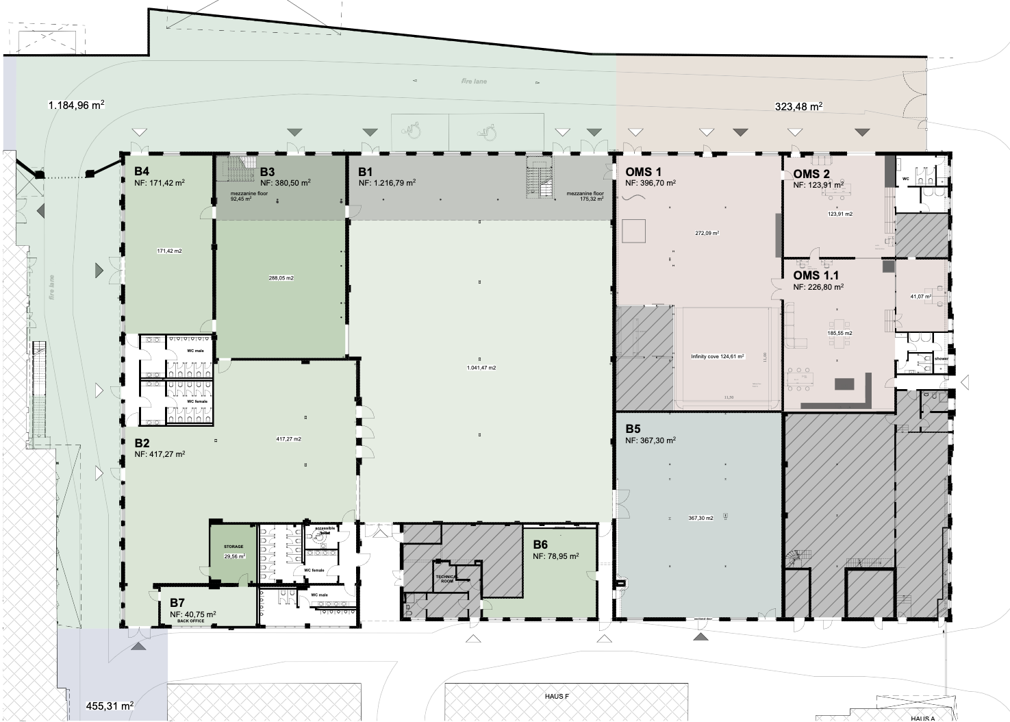 All relevant floor plans and DWG files for Wilhelm Studios – Hall B that are required for the production. This includes all architectural and technical drawings necessary for planning and execution, such as layouts, dimensions, ceiling heights, access points, loading areas, power supply, rigging points, fire exits, and any additional infrastructure relevant to set construction, lighting, sound, logistics, and safety.